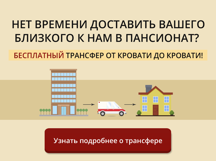 - Пациенты полностью освобождены от каких-либо нагрузок, так как вся забота и уход предоставляется усилиями квалифицированных сотрудников пансиона для престарелых.